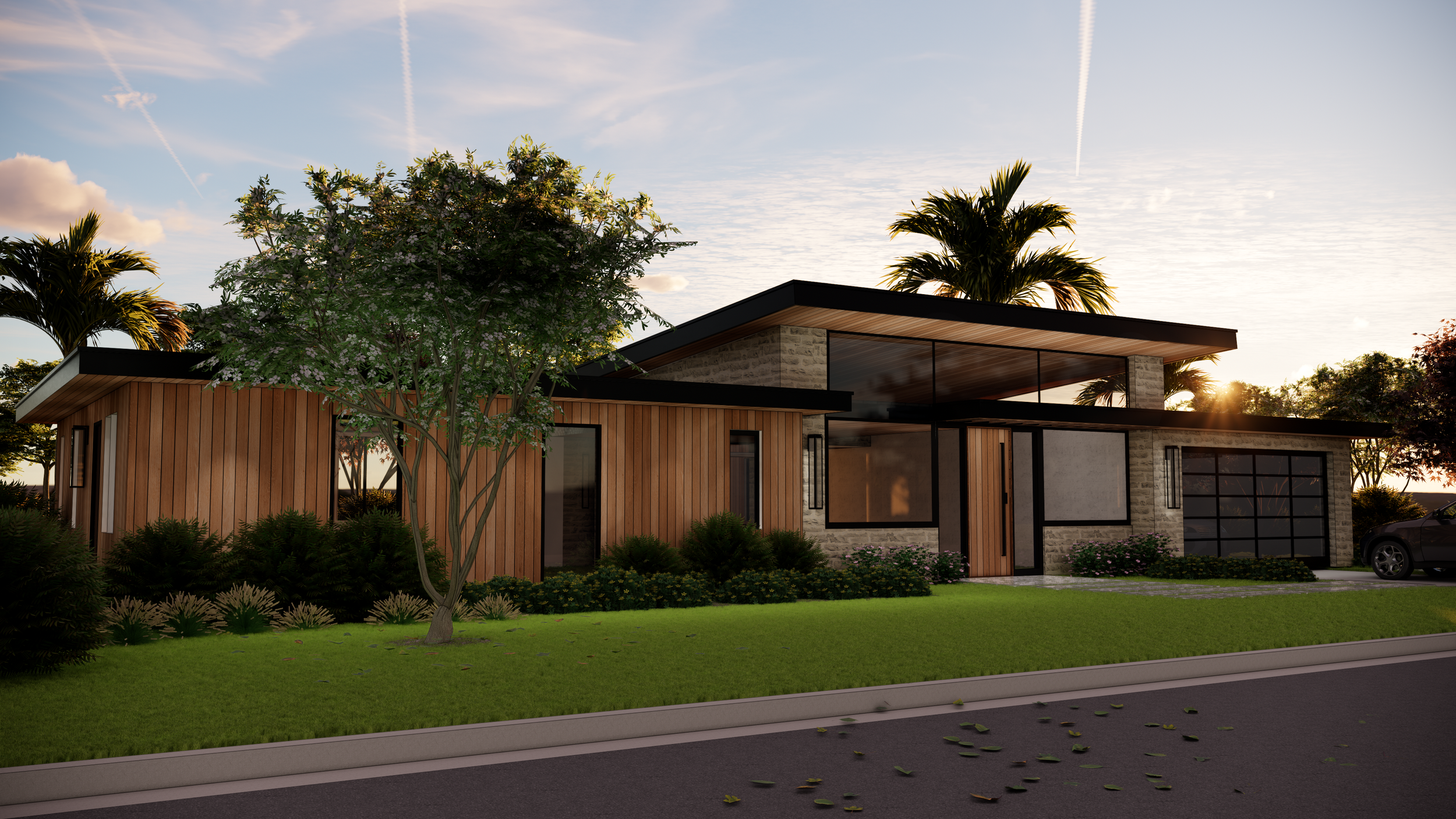A new 2,500-square-foot contemporary residence is in design, featuring an accessory dwelling unit and a refined material palette of stone, wood, and glass. Clean lines and vaulted ceilings define the interior, creating open, light-filled spaces that emphasize simplicity, warmth, and modern living